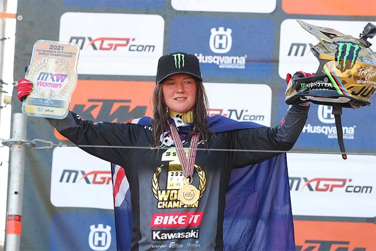 The partnership with Kawasaki has been an outstanding success from day one. Since going Green together with Steve Dixon’s team and Kawasaki Motors Europe in 2019 the dynamic Kiwi has not only won three individual world titles and led Kawasaki to two Manufacturers’ titles she has won ten GPs out of sixteen and taken the chequered flag first in nineteen motos of thirty-two, only finishing outside the top three on four occasions. Even more remarkably this success has been achieved riding KX250 machinery direct from the production line bar a handful of after-market cycle parts and the Green bikes have a 100% clean vest with not a single mechanical failure throughout the three seasons of racing.