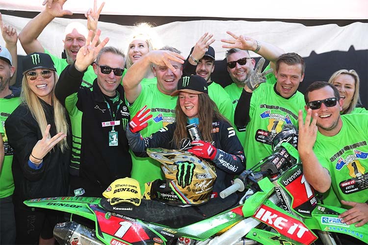 Courtney Duncan: “It’s been an unbelievable day to win my third world title; words can’t describe it ! I was pretty happy with my riding today considering the injuries I picked up last week but I came here with a sixteen-point lead and knew what I had to do. I saw Kiara down on the first lap; I knew I didn’t need to win the first moto so I rode a little conservative to get the job done early and then could go out and win the final race to end the season with a bang. It was nice to clinch the title with a race to go; the competition is tough, we only have six races and the earlier you can win it the better. This year’s been really tough. We’ve had our ups-and-downs but I’ve made the best out of every situation and fought for every single point. What a feeling to do it three years in a row with the same team and the same brand; massive thanks to Steve, the entire team and Kawasaki! I wish I could say I was going home to New Zealand soon now that the season’s over but it’s difficult to travel at the moment so I might be a Brit for a few more months (laughs).“